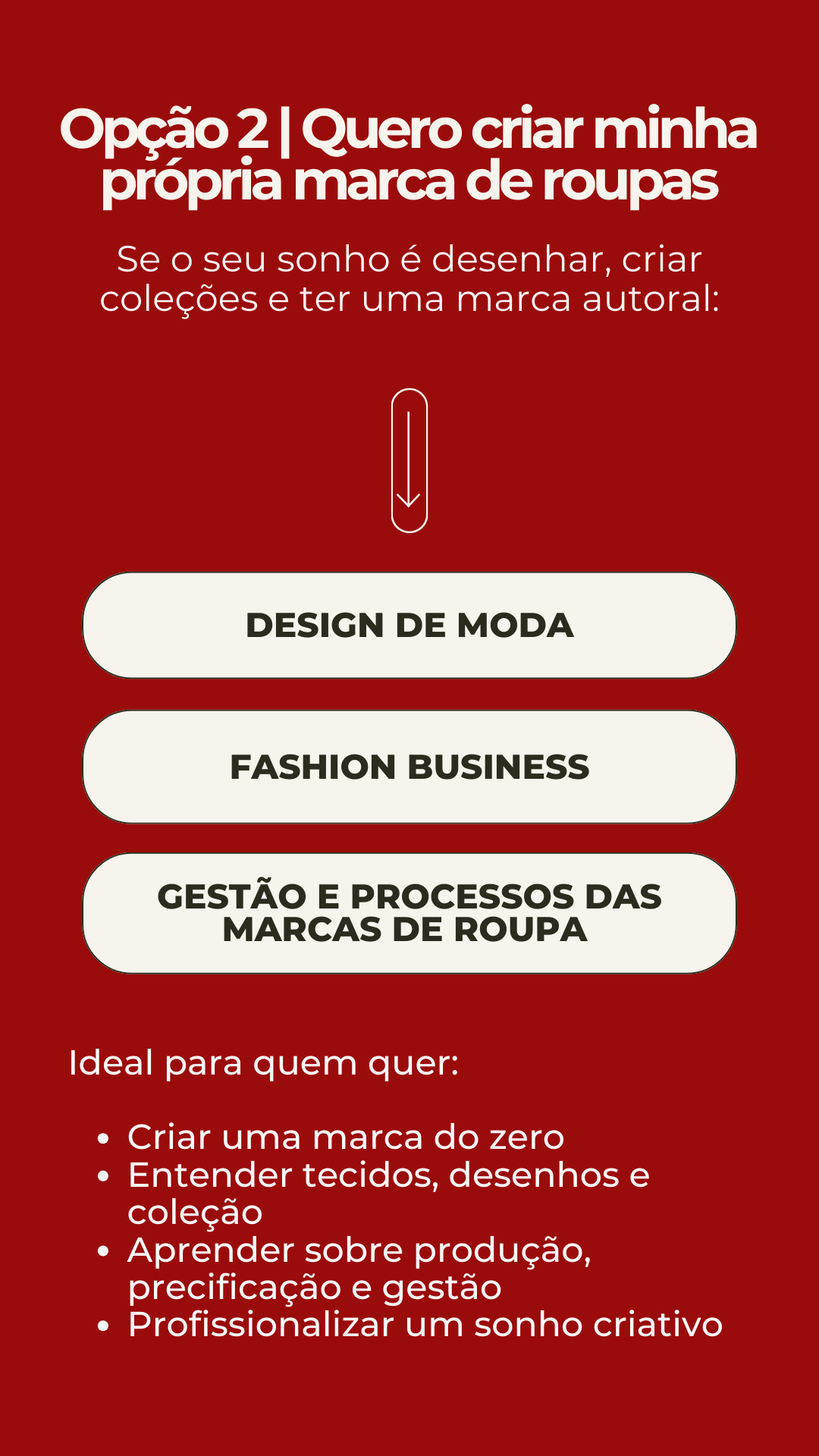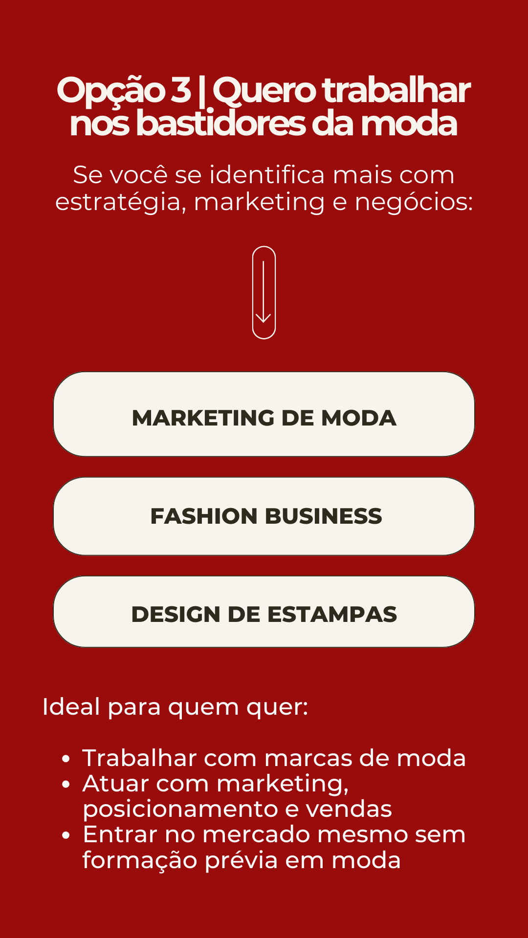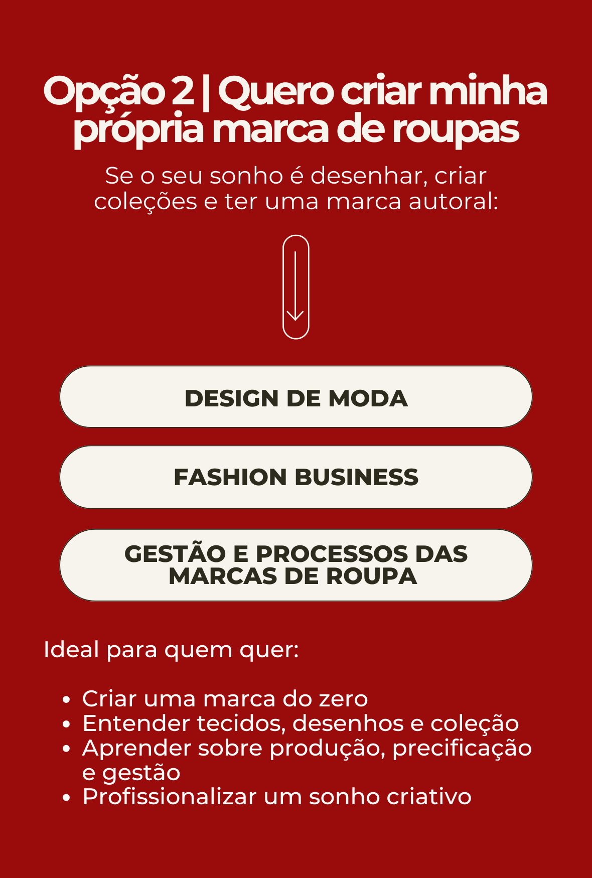nós somos especialistas em transições de carreira para a moda, ajudando pessoas reais a transformarem paixão em profissão, com método, acolhimento e direcionamento.